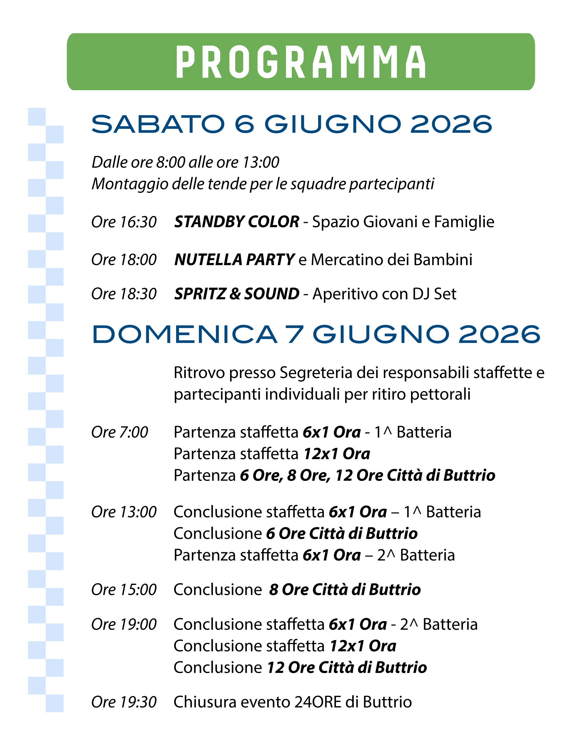 Ore 6:00 – Ritrovo presso Segreteria dei responsabili staffetta e partecipanti individuali per ritiro pettorali